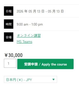 通貨と人数を設定したら、「受講申請 / Apply the course」ボタンを押すことで、お申込者(会社)の詳細情報入力フォームへと進みます。